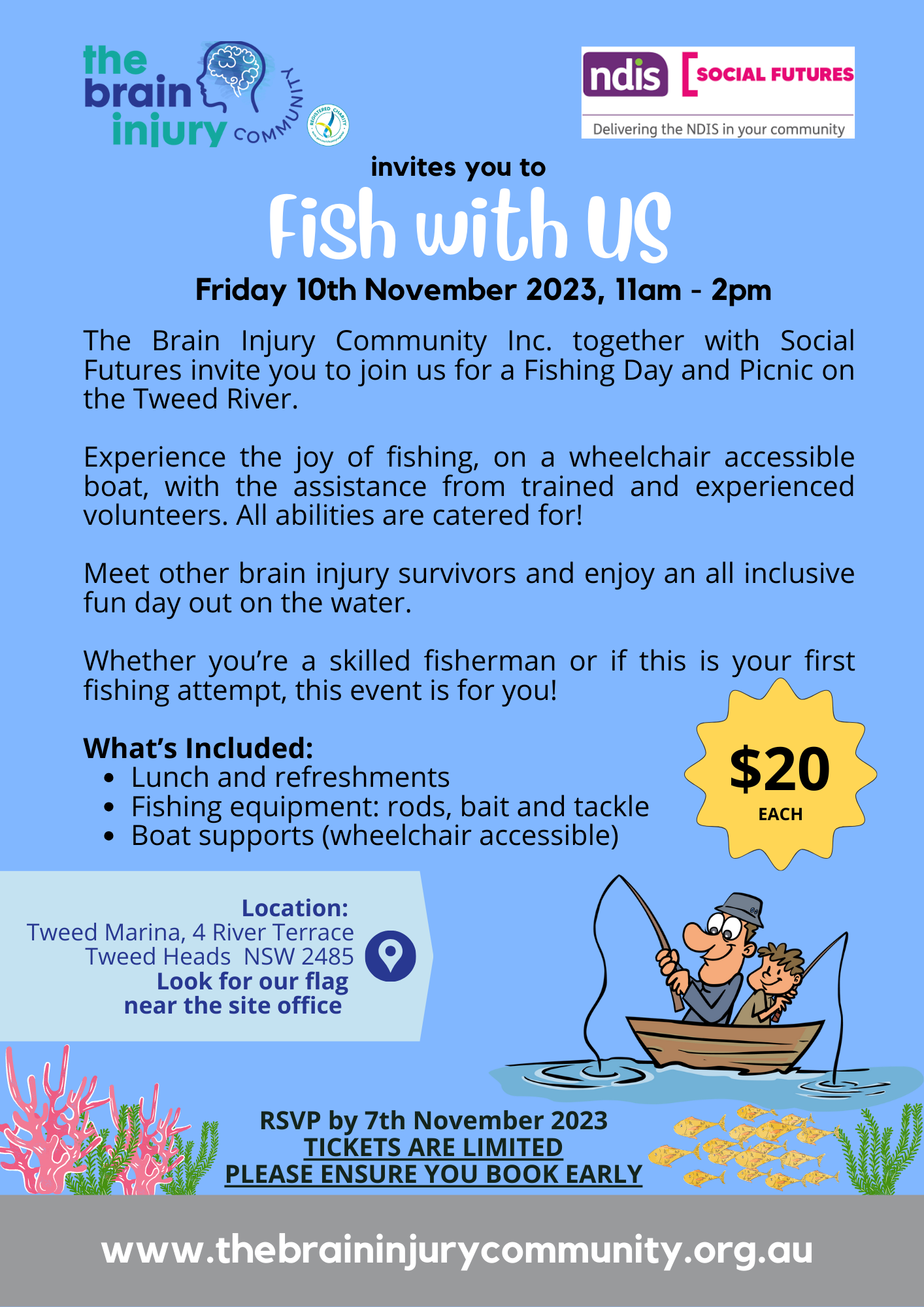 The Brain Injury Community Inc. together with Social Futures invites you to join us for a Fishing Day and a Picnic on the Tweed River.