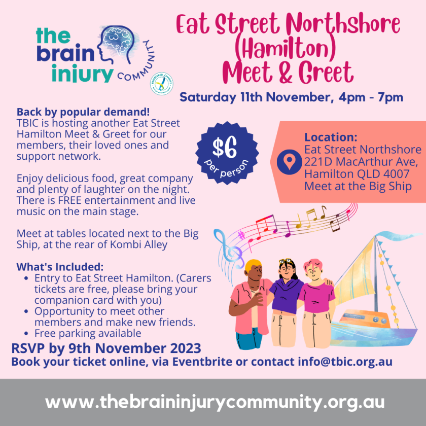 If you have a brain injury, know or care for someone who does – The Brain Injury Community Inc invites you to join us on Saturday 11th November 2023 where we will be exploring the wonders of the Eat Streets venue as well as sampling delicious dishes and tasty treats from six of the world’s seven continents.