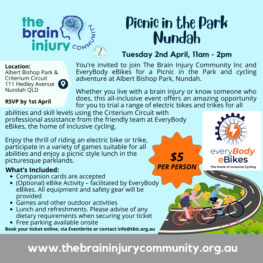 You’re invited to join The Brain Injury Community Inc and EveryBody eBikes for a Picnic in the Park and eBike cycling adventure at Albert Bishop Park, Nundah. Sample a range...